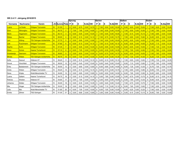 Der Wettkampf wurde in vier Doppeljahrgängen ausgeschrieben. Bei den Ältesten in der AK 15/16 geht der Titel an Emilia Sommer vom Haaner TB, der Vize Titel an Charlotte Schleife. Den Bronzepokal bekam Kira Rudenko beide Hildener AT. Dazu verpasst Lara Rudko vom TSV Aufderhöhe mit Platz vier knapp das Treppchen, kann sich aber über einen Startplatz bei den Regionalmeisterschaften im Juni in Wermelskirchen freuen ebenso wie alle weiteren Starterinnen in dieser Altersklasse: Elisa Tresse und Elisa Scholz, sowie Marilou Monteforte vom Haaner TB, Marien Heidemann vom WMTV und Lotta Peter von der SG Langenfeld. Alle haben dann die Möglichkeit mit einer erneuten Platzierung unter den Top Ten die Teilnahme an den Rheinischen Meisterschaften im Juli in Ohligs zu sichern.