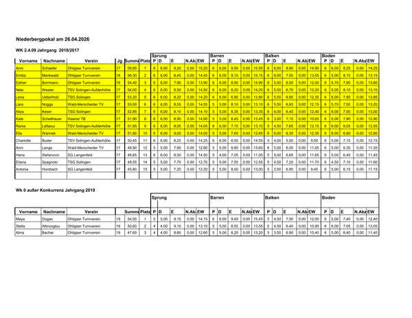 Der Niederbergpokal ist die Verbandsmeisterschaft der P Stufen Turnerinnen des Turnverbandes Niederberg und gleichzeitig die erste Stufe der Qualifikation für die Rheinischen Meisterschaften, die Mitte Juli in der OTV-Halle in Solingen stattfinden werden.